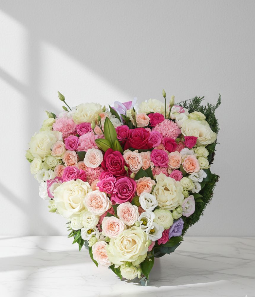 Ефектно сърце от мини рози и едри рози ще впечатли Вашата нежна половинка. Заложете на любовен подарък, който носи в себе си много нежност и красота.