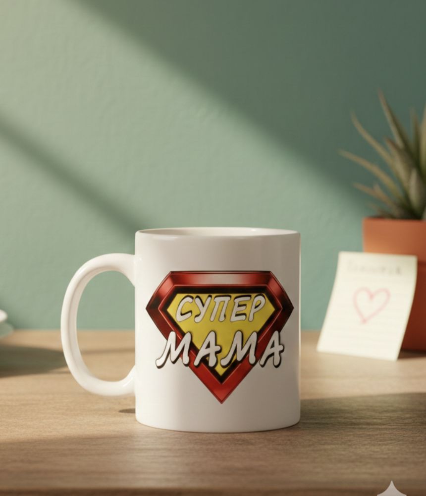 Керамична чаша с надпис "Супер мама" е страхотна изненада за майки по случай Осми март, Коледа, имен ден, рожден ден. Заложете на практичен подарък с готино послание, който ще кара мама да се усмихва всеки път, когато пие чай или кафе от чашата.
