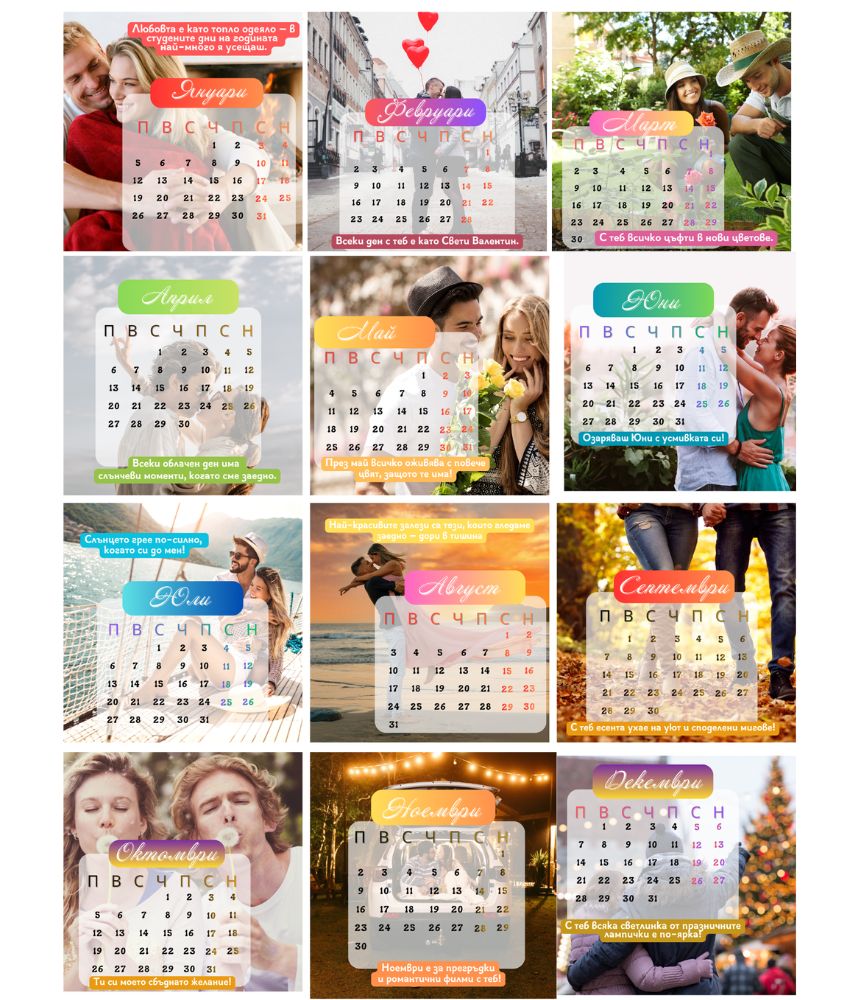 Изработен от премиум гланц картон, календарът включва 12 вдъхновяващи мисли за любовта – по една за всеки месец. С елегантно дървено стативче, което го превръща в нежна декорация за бюро или рафт. -