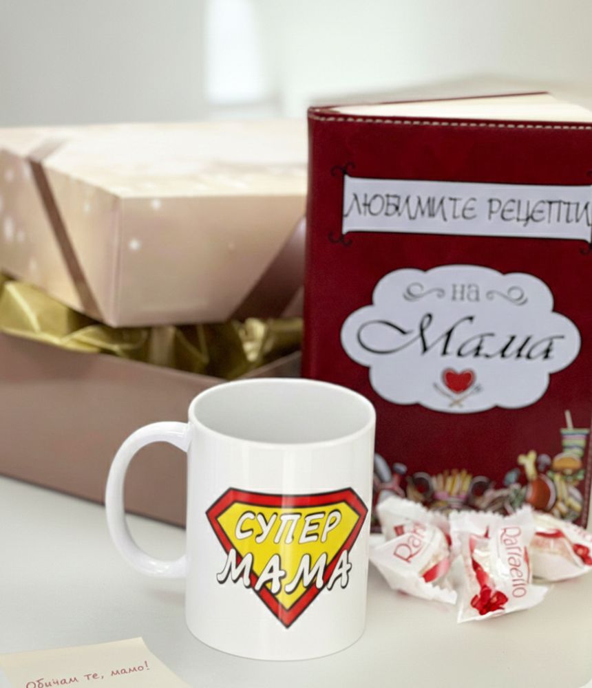 Страхотен подаръчен комплект за майка, който да поръчате по случай имен ден, рожден ден, Коледа, Осми март или без повод, като израз на внимание и благодарност! Подаръчният комплект за Мама включва тефтер за рецепти, керамична чаша и 3 бонбона, аранжирани в подаръчна кутия.