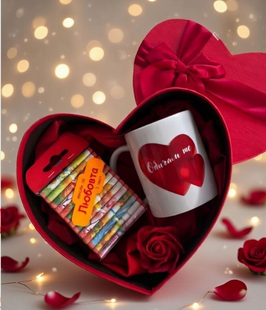 Вечните рози запазват своята красота дълго след подаряването – символ на любов, която не увяхва. Любовните късметчета носят усмивка и лично послание, а стилната чаша добавя практичен и топъл акцент към романтичния жест – за споделени сутрини, чай или кафе с мисъл за любимия човек.