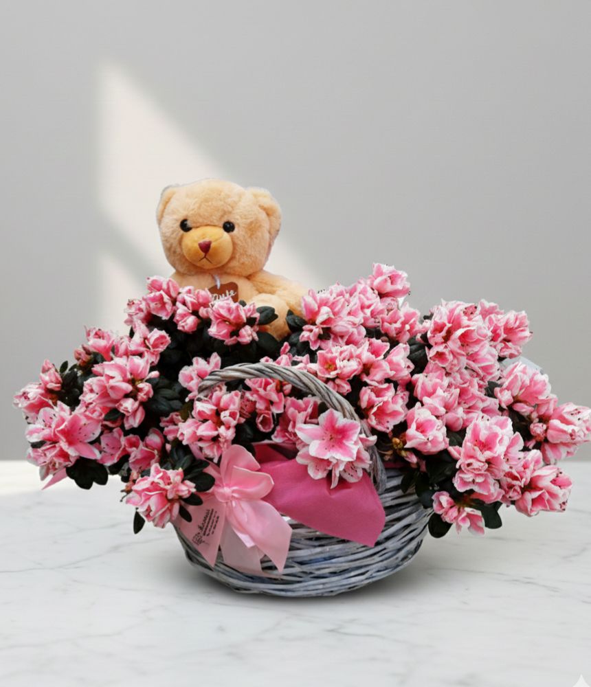 Подаръчна кошница с плюшено мече и азалии - един ефектен подарък, с който ще изненадате приятно гадже, приятелка, колежка или сестра!