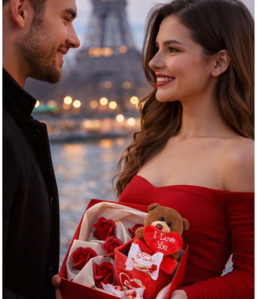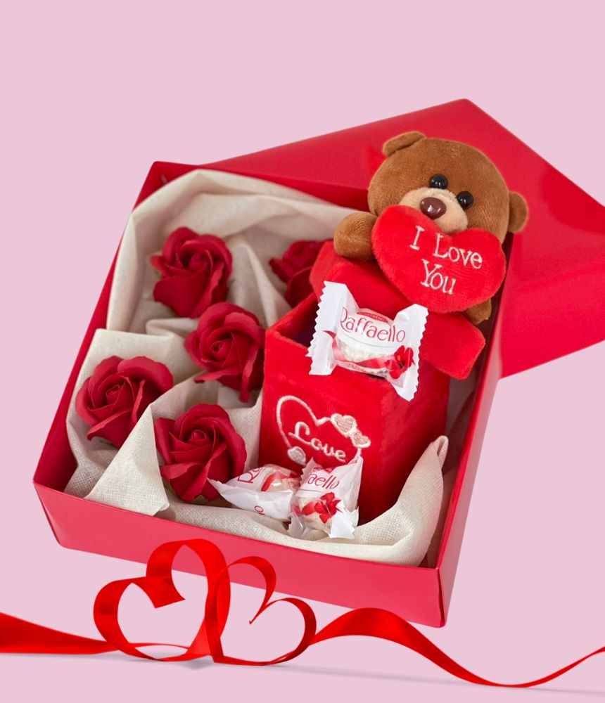 Gift Set "bear in the box" is a very sweet gift for any occasion. In a beautiful retro box are collected chocolates Lindt, eternal red roses and teddy bear with the inscription "I Love You".