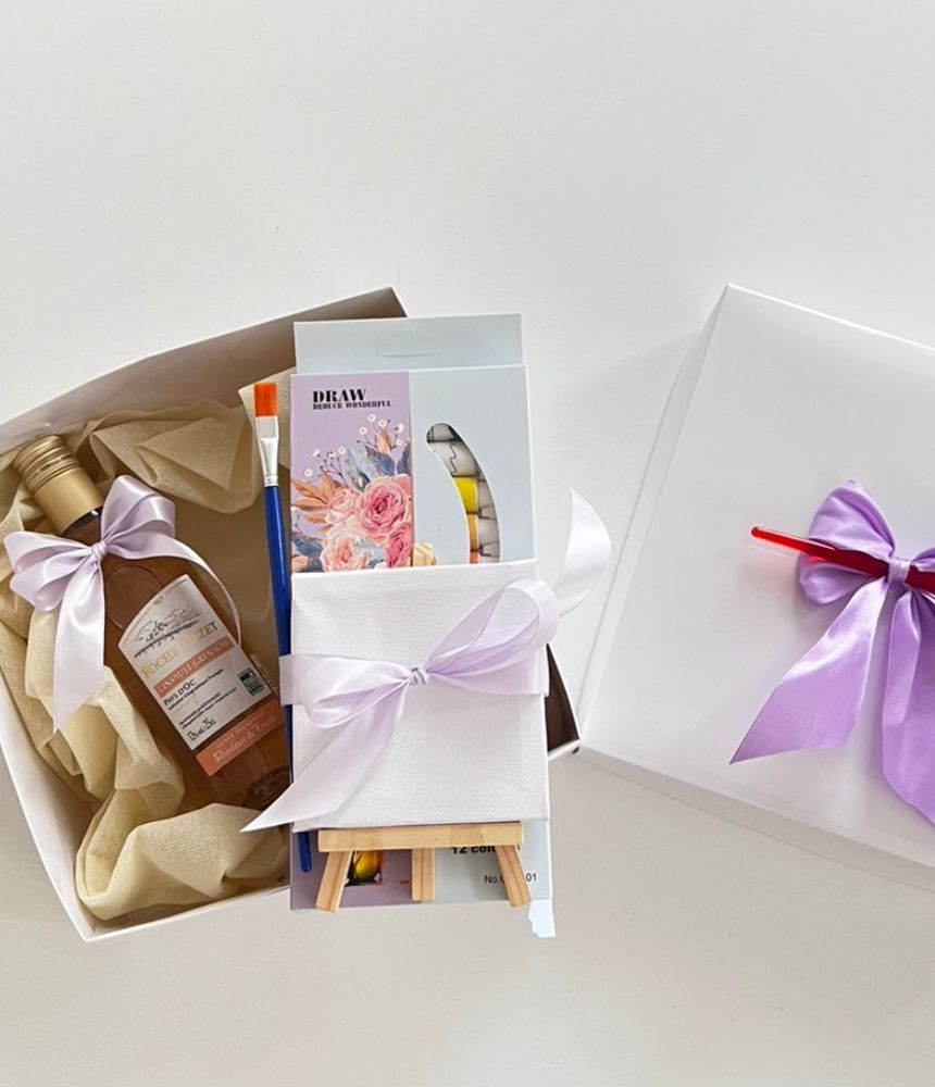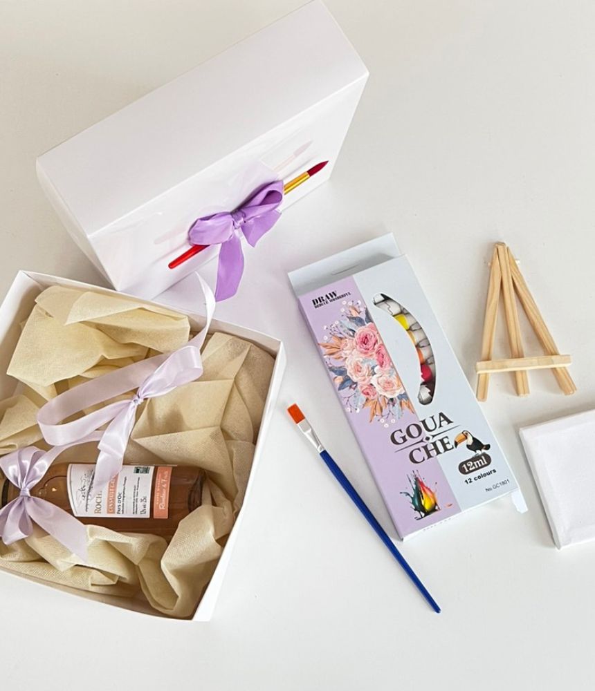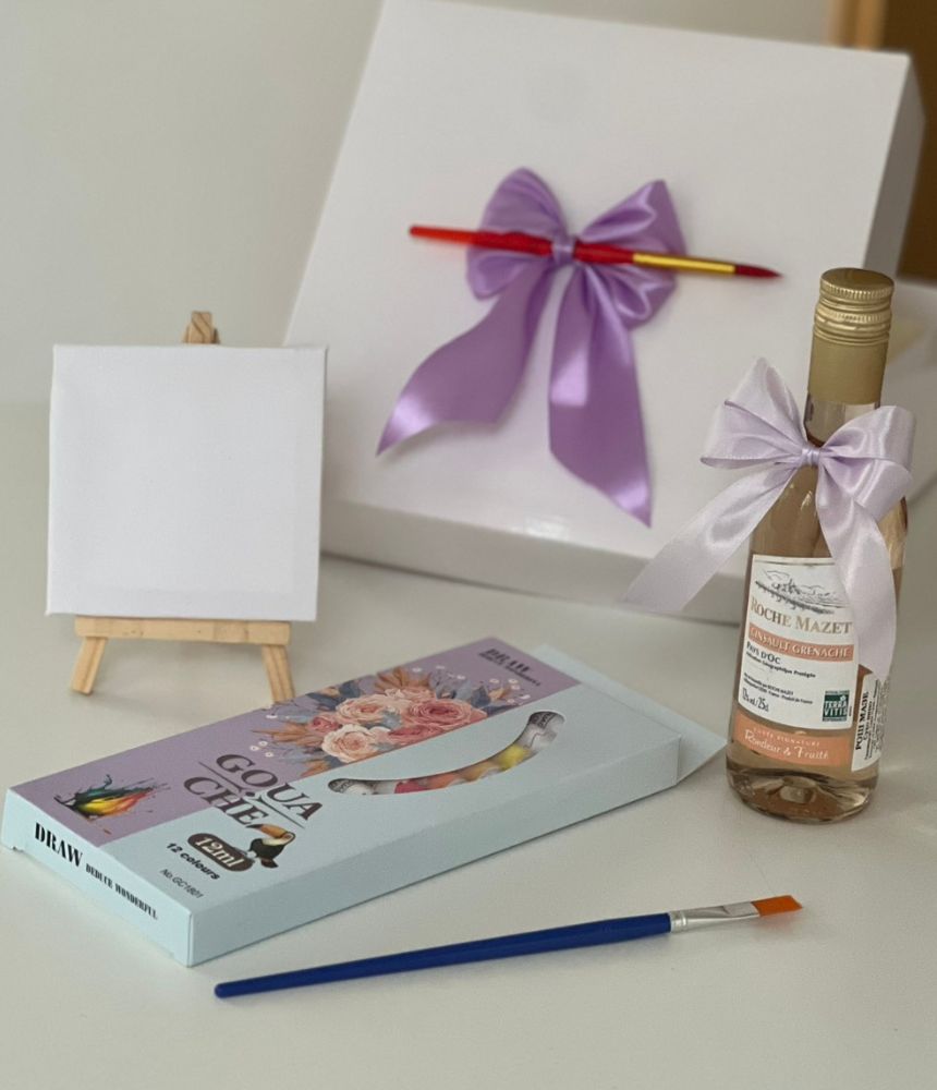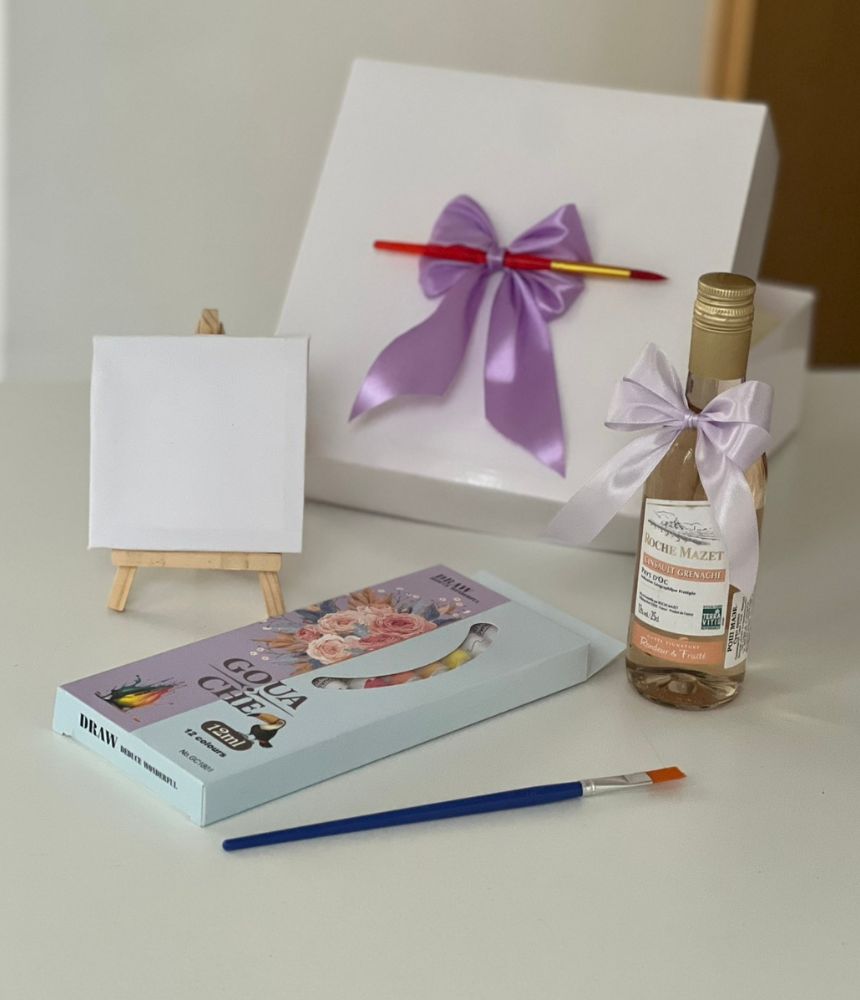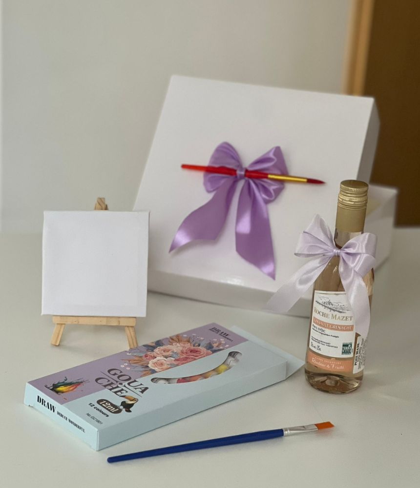 Подаръчен комплект Любов, рисуване и вино - този уникален подаръчен комплект съчетава три удоволствия в едно: изкуство, емоция и вкус.