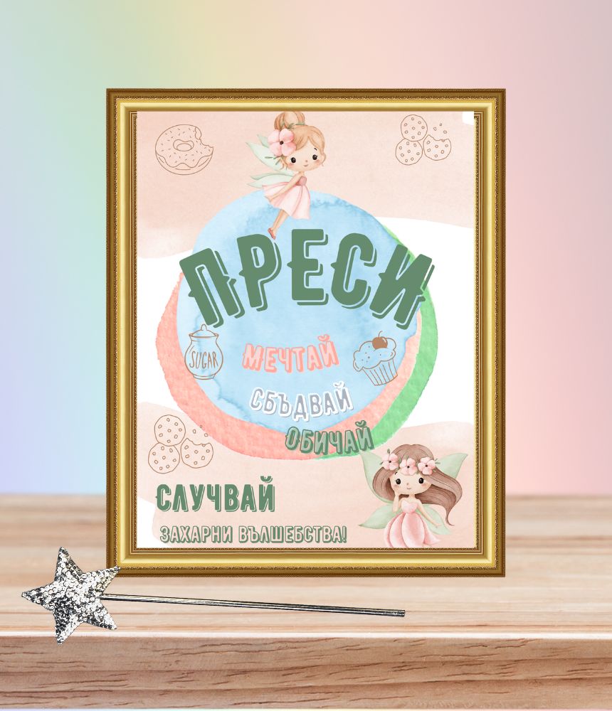Персонализиран колаж за детска стая Ванилени истории е стртахотна идея за подарък за стаята на вашата племенница или по-малка сестра, която обожава Феята от Захарницата. Пожелайте радост и щипка ванилия за рожден ден, имен ден или началото на училище!